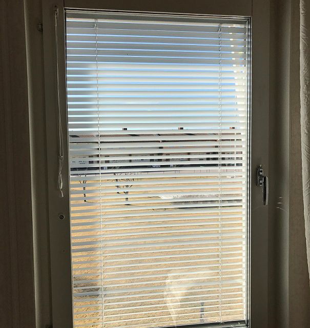 Renoverad o monterad. Den renoverade persiennen fungerar lika bra som en ny persienn, håller lika länge och jag lämnar 2 års garanti. På bilden syns persienn som är lagad mellan glas.
